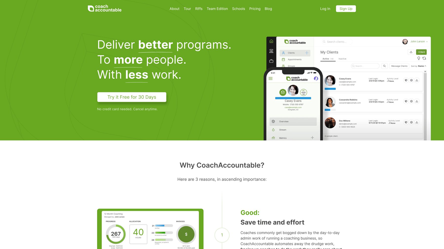 Exercise.com vs Coach Accountable: with adequate scheduling software, Coach Accountable works well for certain gyms, but top tier gyms who want to succeed online and in-person, and deliver all varieties of workouts at scale, send fitness assessments, and use powerful gym booking and billing automations are all things that you can get with Exercise.com, so you can run your entire business in one place.