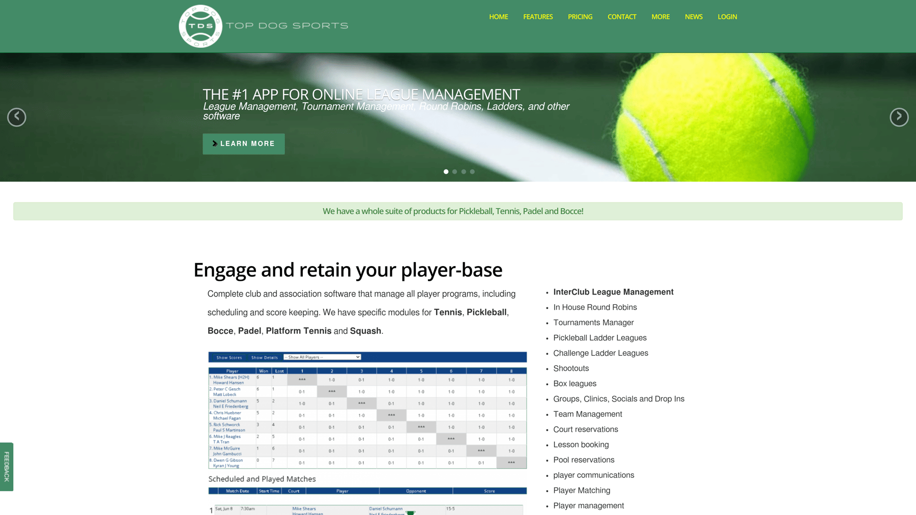 Founded in 1990, TopDog Sports is a league management software for tennis, pickleball, Bocce, Patel, platform tennis, and squash. TopDog Sports provides features such as scheduling, scorekeeping, standings, and online registration. You can arrange round-robin events, tournaments, box leagues, and a ladder-style leader board. Customers can make reservations for courts, swim lanes, or fields.