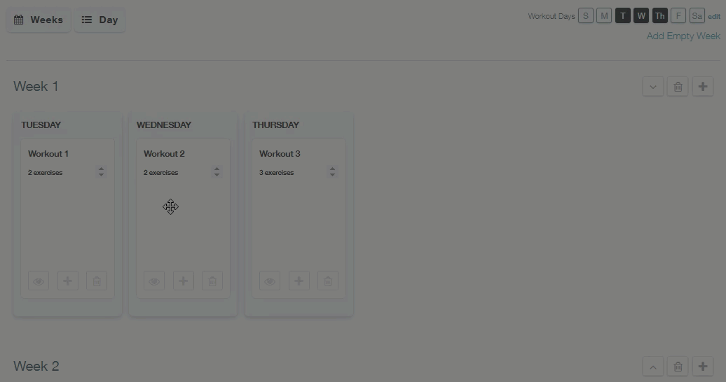 Here’s how to add exercise notes to any exercise within a workout, starting from the “Weeks View” of the Workout plan Creator. Step-by-step instructions are below.