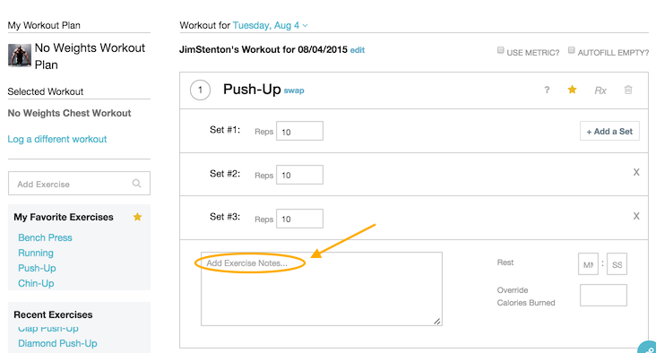 As you log a workout from the Exercise.com website, you can add notes to each exercise in the workout.