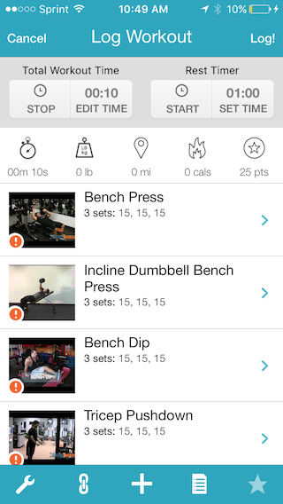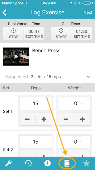 To add exercise notes in the iPhone app, begin by logging a workout in the app as usual. In the workout plan, tap the exercise that you want to add notes to.