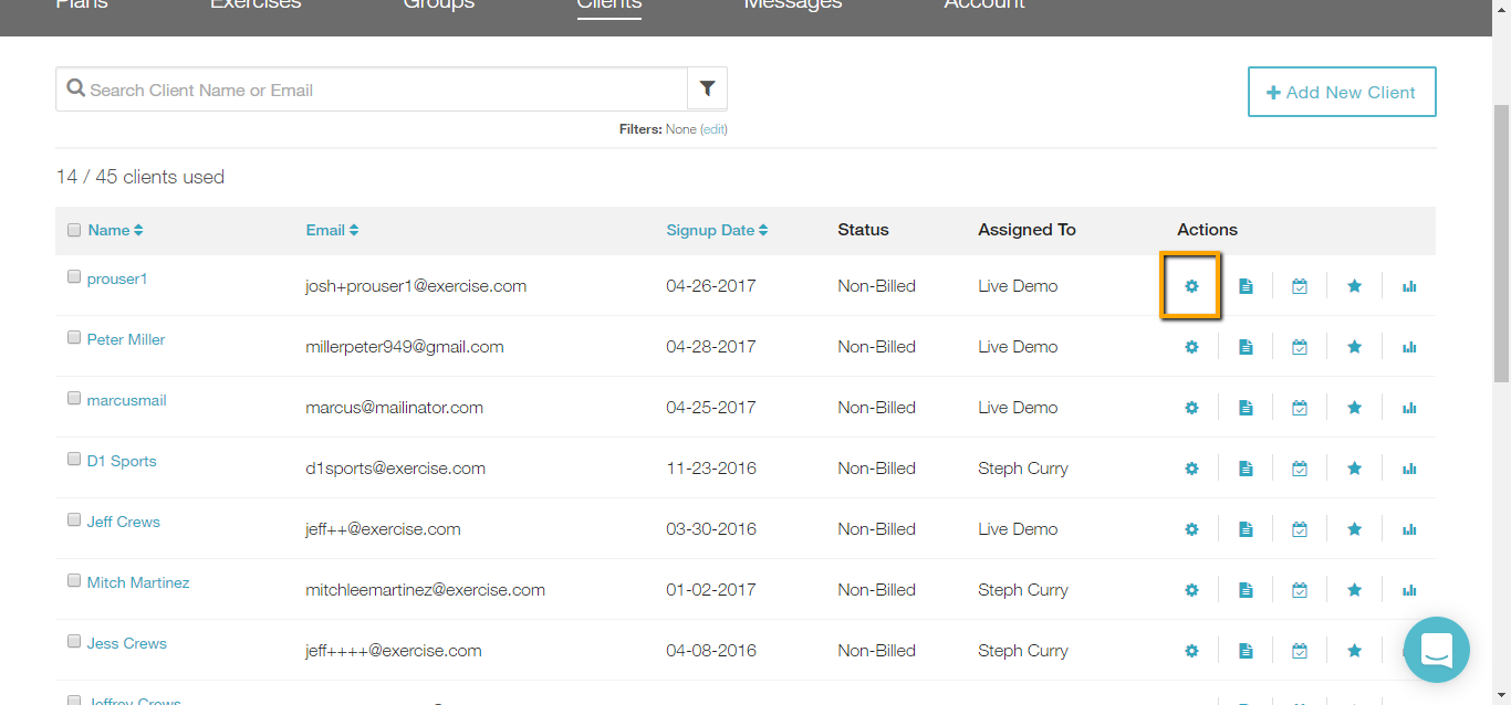 Select the manage wheel for the client you’d like to assign nutrition goals to.