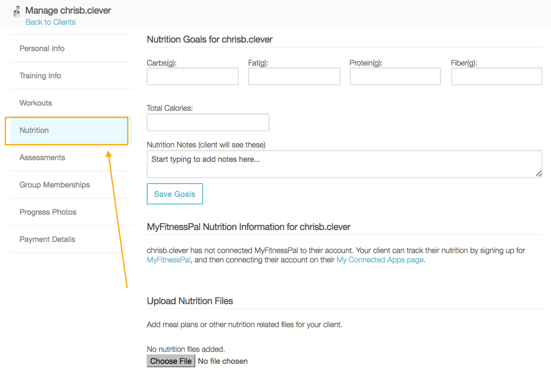 In the client management window, select the “Nutrition” tab from the menu on the left side of the screen. Then, from the “Nutrition Goals” view, enter the information, such as carbs, fat, protein, and total calorie limit, for your client.