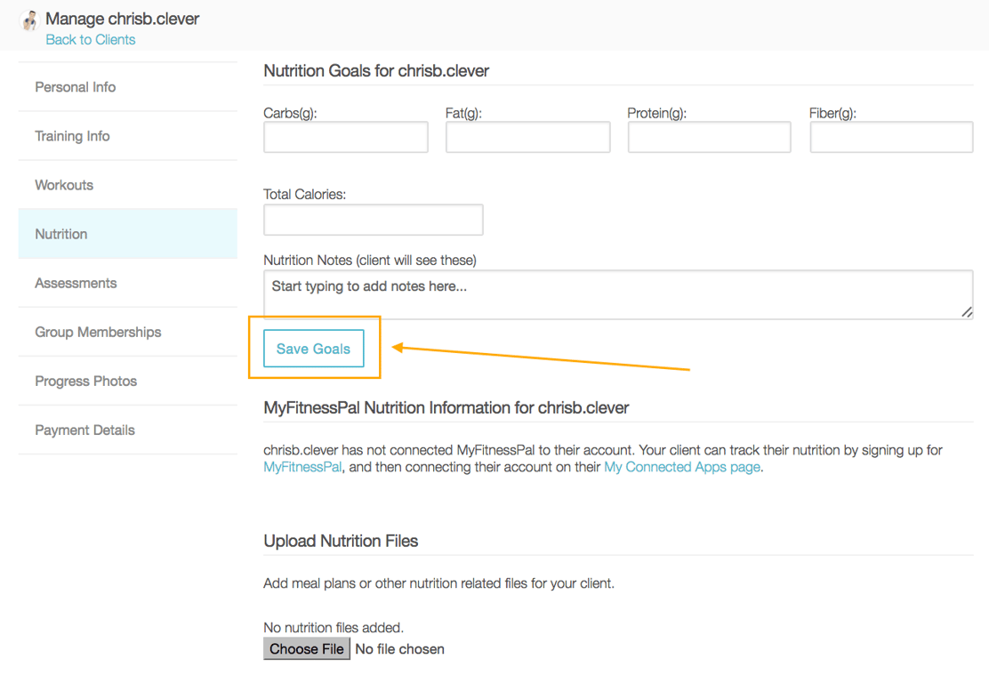 What’s the perfect pairing to workout goals? Nutrition goals! Because nutrition can be intimidating for your client to manage alone, you can now set goals for them through the client dashboard! Follow the steps below to get started.