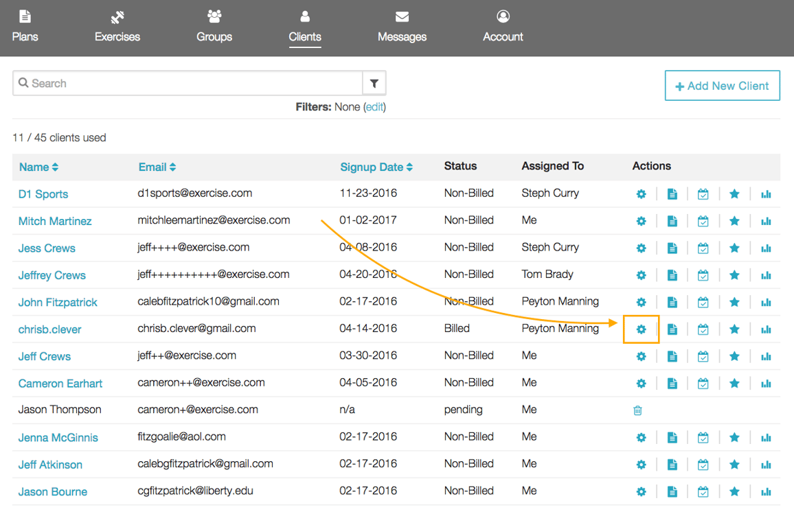 From the client list in the “Clients” tab of your dashboard, locate the client to whom you want to assign nutrition goals. To the right of his or her name, look for the gear icon; click on it.