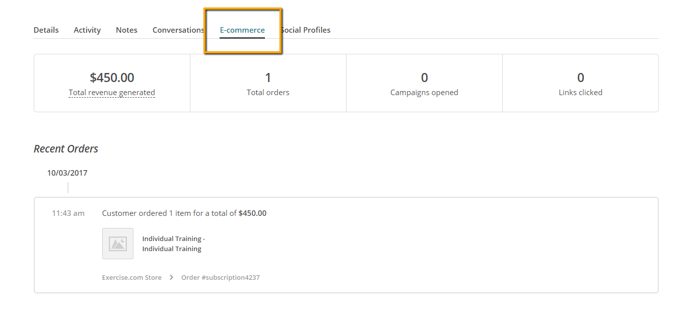 To see this information in Mailchimp, find the purchaser’s profile on your list, and click the “E-commerce” section: