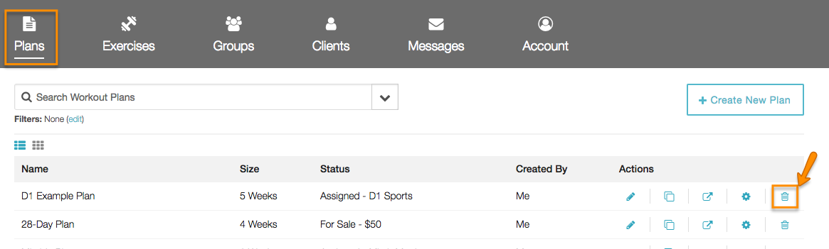From the “Plans” tab of your Trainer Dashboard, locate the workout plan that you want to delete. In the thumbnail of that workout plan, look for the trash can icon.