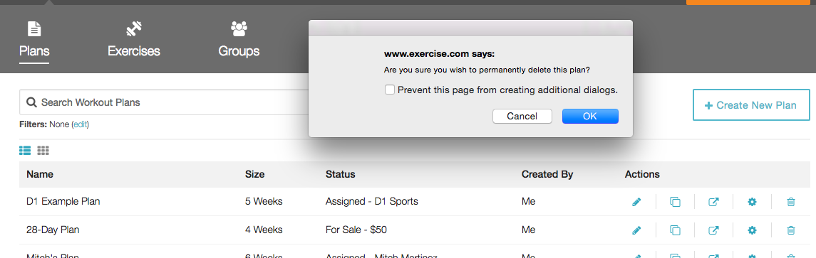 Click on the trash can and when the pop-up window appears, confirm the delete. The workout plan will then be permanently deleted.