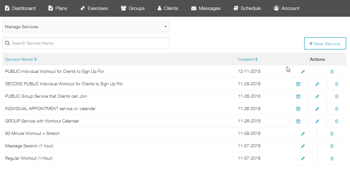 This screen allows you to view and edit all the the different services you’ve created, like classes or appointments. You can also create new services.