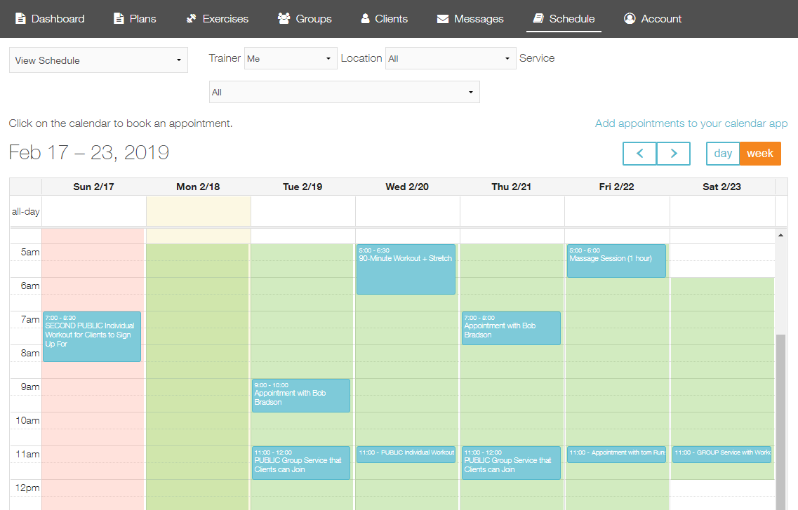Make sure to test out the filter options, which you can use to narrow down the appointments shown on the calendar by trainer, location, or service.