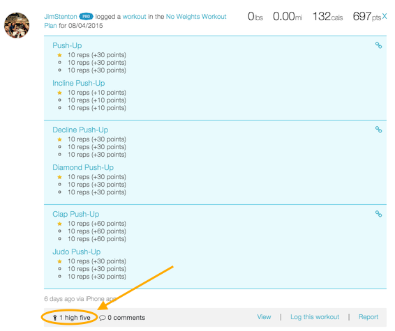 The high five button is a great way to encourage your fellow Exercise.com members to achieve their workout goals. Anytime you see someone in the activity feed who is working hard, be sure to give them a high five.