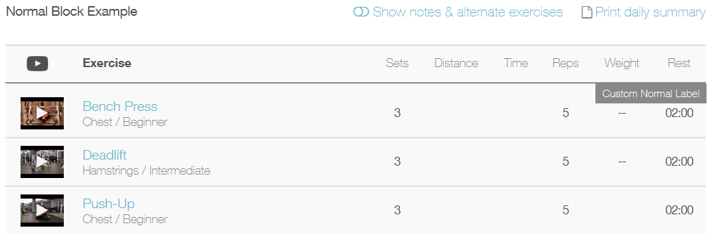Normal blocks are just like any regular workout where you complete all sets of each exercise before moving to the next exercise.