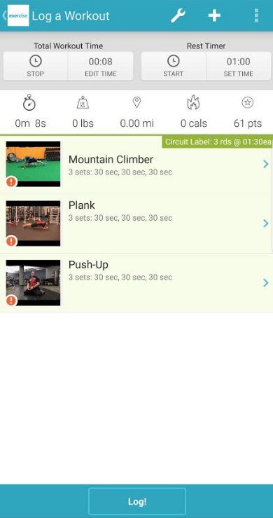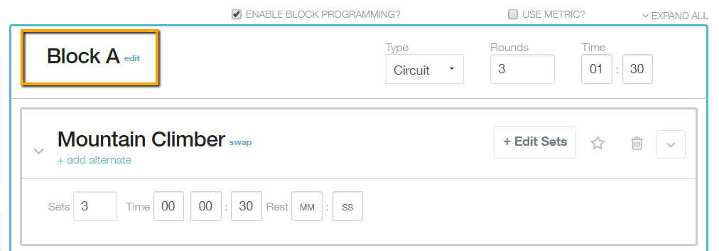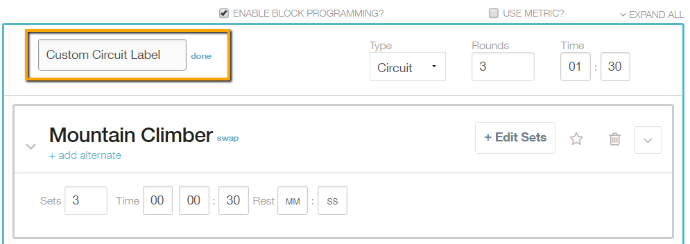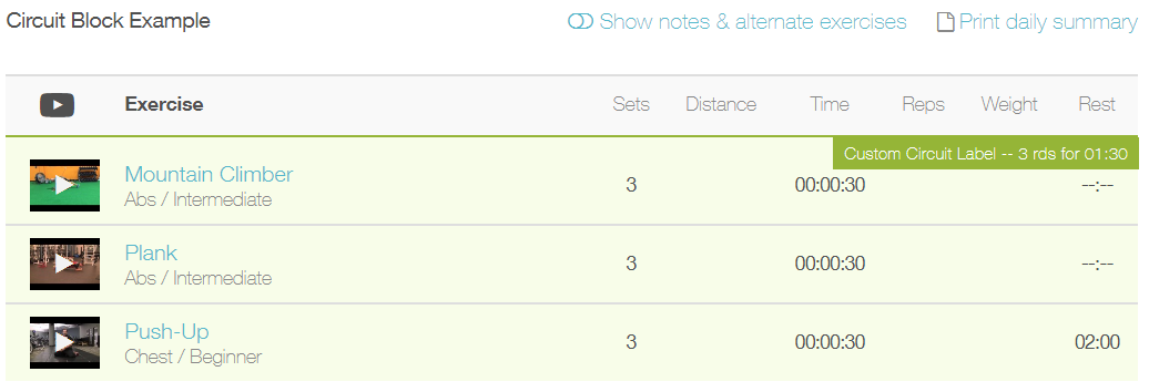 Circuit blocks (indicated by the green background) are similar to Superset blocks, but they allow for a time per round requirement for each exercise in a set.