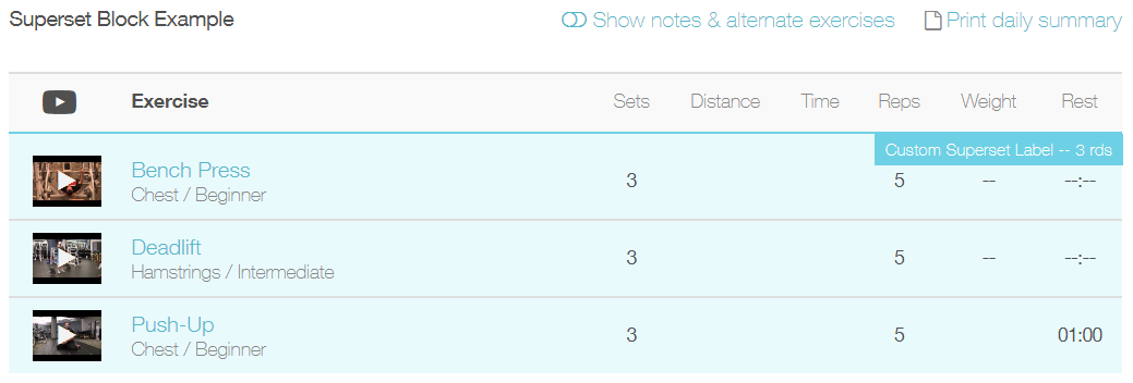 Superset blocks (indicated by the blue background) call for completing one set of each exercise in the superset before starting over from the beginning.