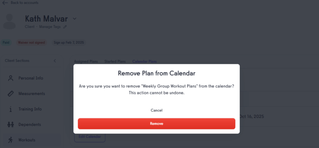 Select “Workouts,” then “Calendar Plans,” and click “Remove Plan.”