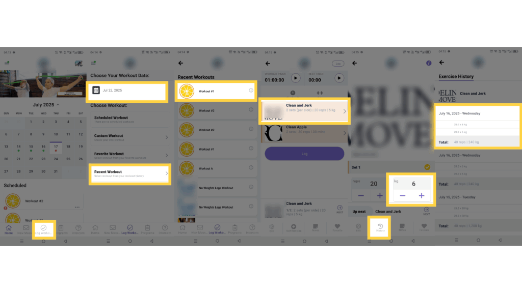 Log in to your mobile app. From the dashboard calendar, tap “Log Workout” on the bottom bar. Choose the date you want to log a workout, then select a recent workout. Once you’re in the workout logger, you’ll notice that the exercises have prescribed weights set by the trainer. Tap on any exercise, and you’ll see that the weight fields are automatically filled based on your workout history. To confirm this, tap “Exercise History” at the bottom. You’ll see that the most recent logged workout for that exercise matches the auto-filled weight values.