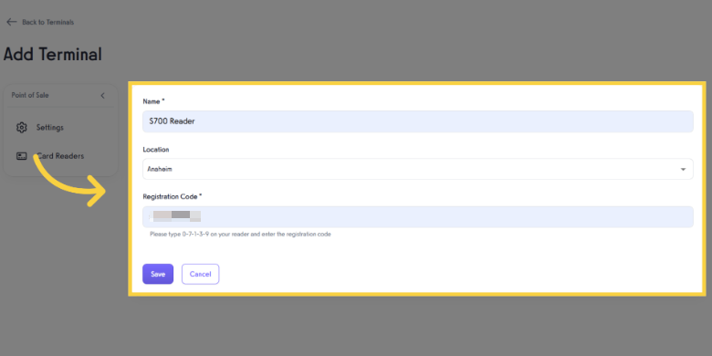 Go back to the Point of Sale page and select “Card Readers”, then click “Add Terminal”.
