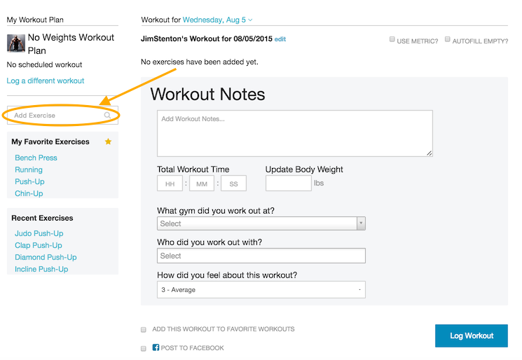Then use the “Add Exercise” search box on the left side of the workout logger to add the exercises that you completed during your workout to your custom workout plan. Adjust the sets, reps, and weights as needed.