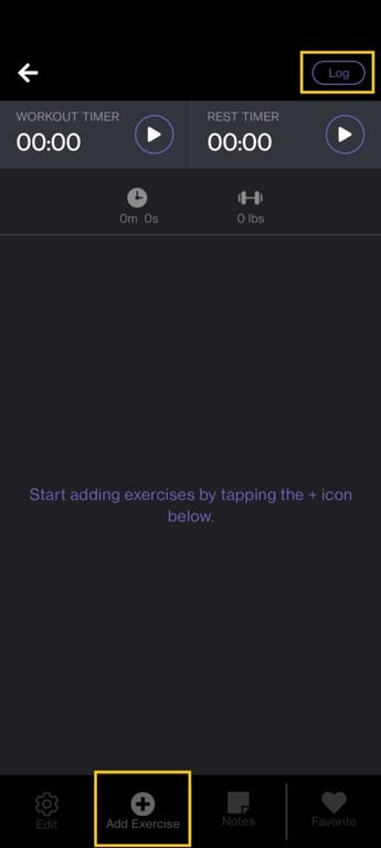 Use the Add Exercise search box to find and add each exercise you performed. Adjust sets, reps, and weights as needed to match your workout.
