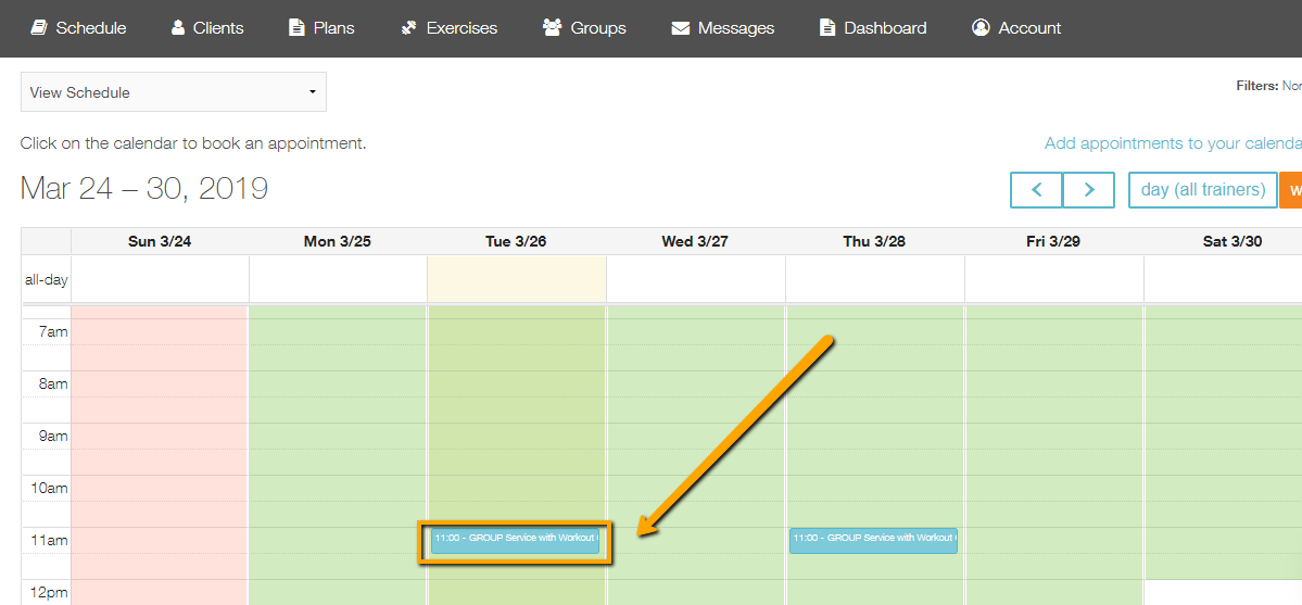 Here’s how to access your Trainer Dashboard SCHEDULE tab to log a group class workout for all attendees.