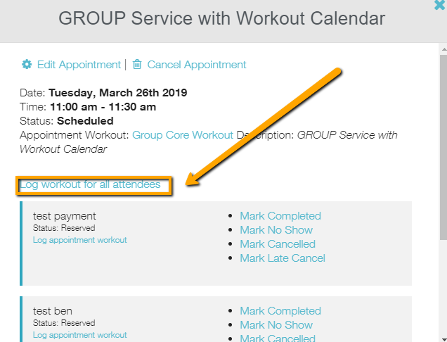 NOTE: In order for this to be possible, it must be a group class appointment with a workout that is scheduled on the service calendar.
