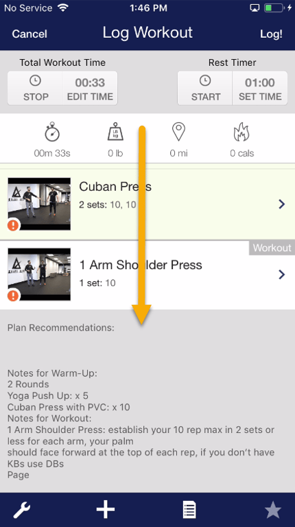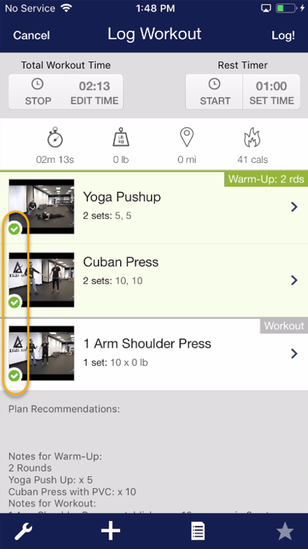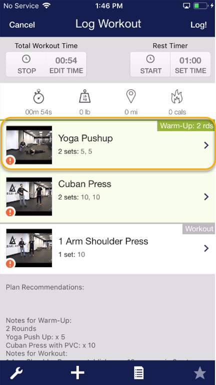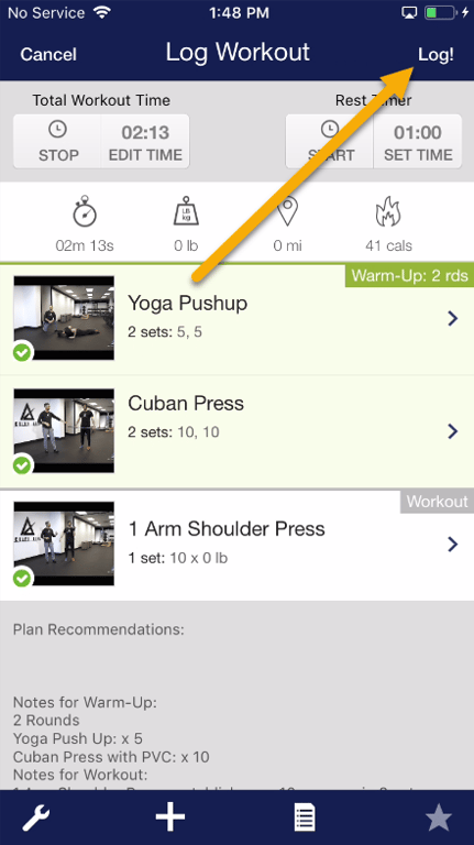 Step 7: Once all exercises have been completed, tap the “Log!” button to submit your workout.