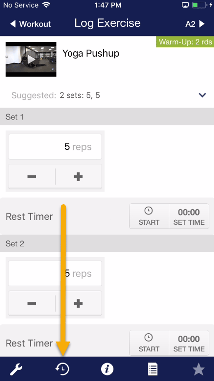 Step 4c: Tap the history icon to see what you logged previously for this exercise.