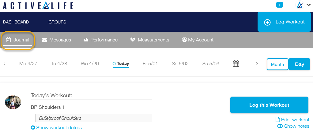 Step 1: Open the Journal tab on your Dashboard to see your scheduled workouts.