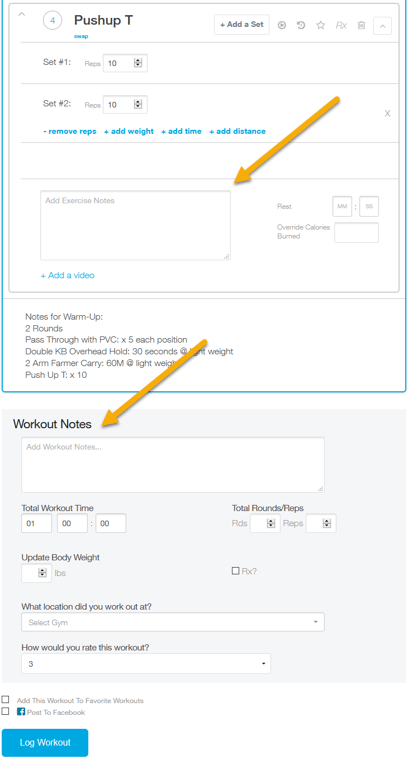 Step 4c: You can enter notes to leave feedback for a specific exercise or for the workout as a whole.