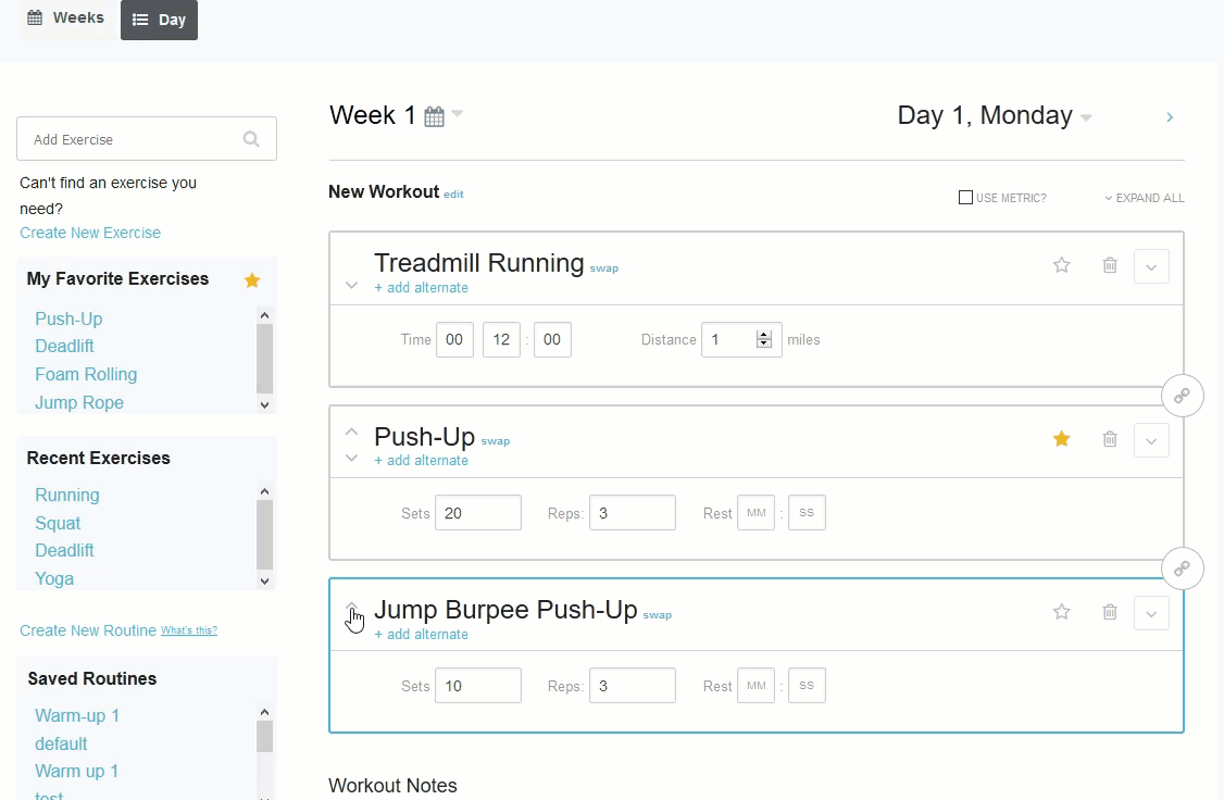 By using the up and down arrows to the left of the Exercise’s name, you can now rearrange exercises in your workout plan.