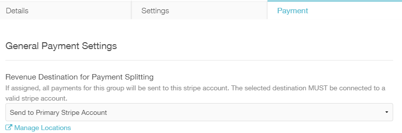 If a Group has a location assigned under Payment settings, payments will go to that location’s account. Otherwise, group payments will be routed to the primary Stripe account for the platform.