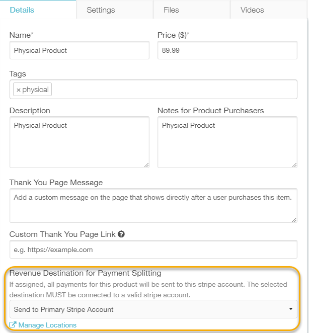If a Product has a location assigned under Payment settings, payments will go to that location’s account. Otherwise, product payments will be routed to the primary Stripe account for the platform.