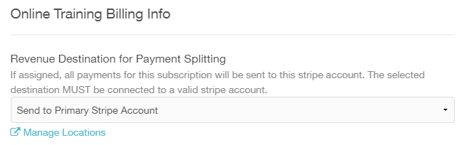 If Online Training has a location configured on the “Customize Platform: Clients” page, payments will go to that location’s account. Otherwise, these subscription payments will be routed to the primary Stripe account for the platform.