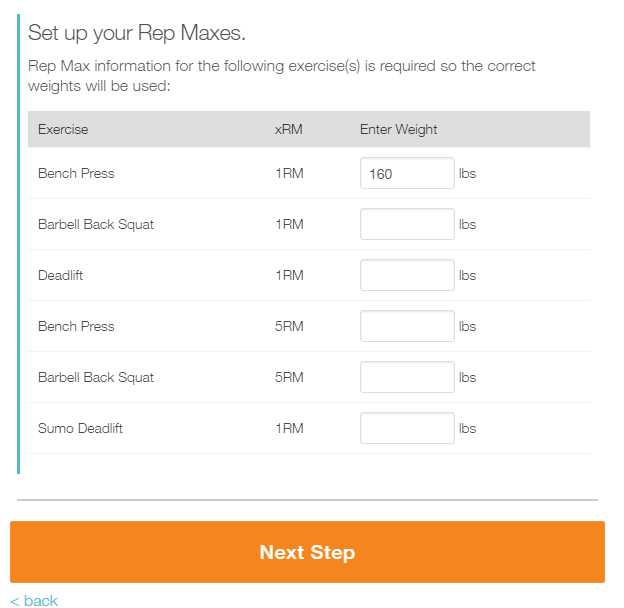 Click “Next Step” to proceed with inputting Rep Max information, if applicable.