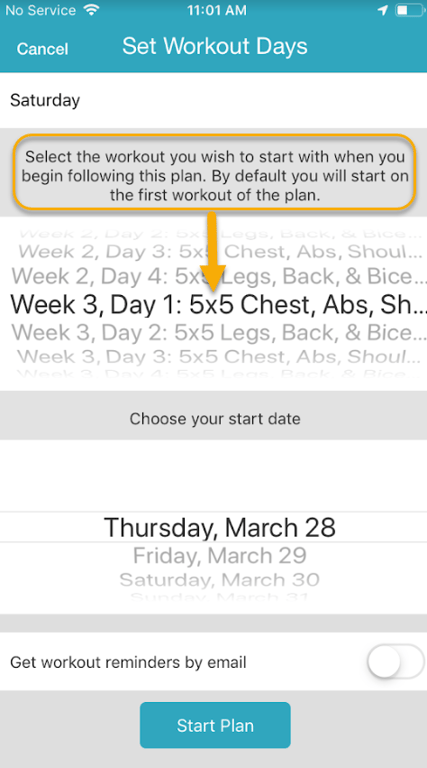 In the “Schedule Workout Plan” pop-up window, locate “Choose first workout” and, directly to the right of that option, click on the drop-down list.