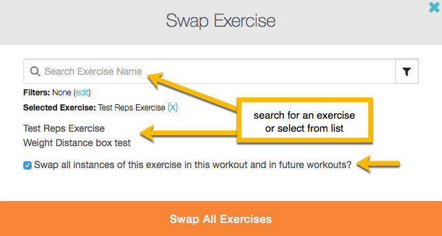 To swap future workouts check the “Swap all instances of this exercise in this workout and in future workouts” box. If unchecked the exercise will be swapped just for this workout. Click on the “Swap All Exercises” to save.