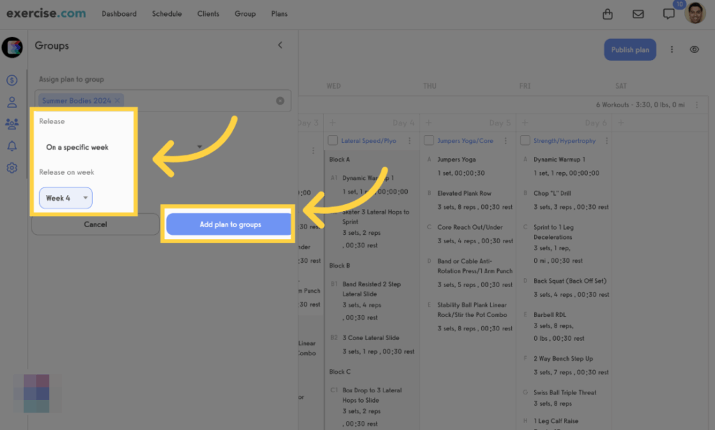 With the Exercise.com Workout Plan Creator, you can schedule time-released workout plans for your groups, making it easy to deliver training content automatically over time. Follow the steps below to learn how to set this up.