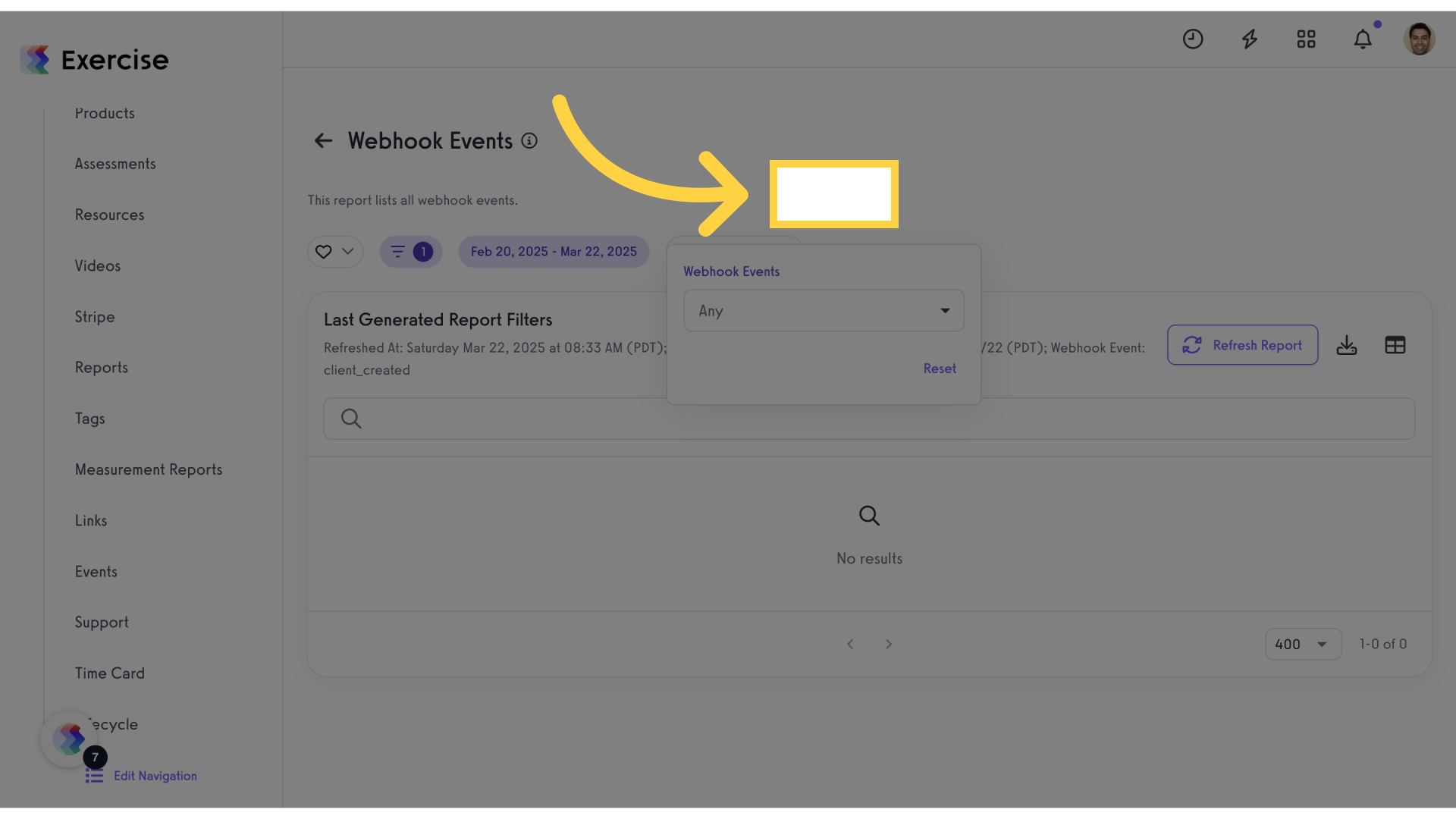 Select and expand Trainer Reports, then choose the Webhook Events report.
